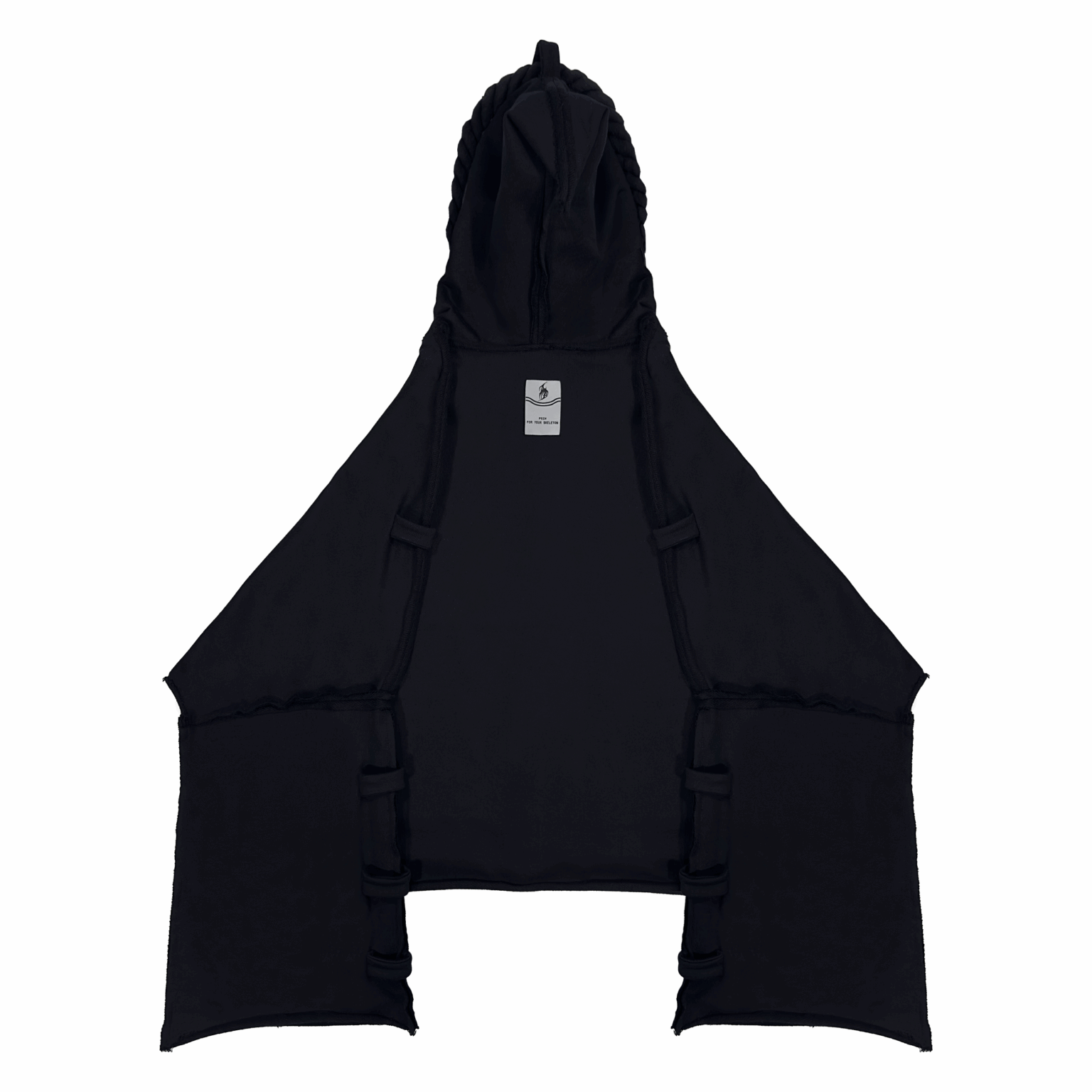 Слегка расклешенные рукава, острый капюшон, акцентная бирка на спинках изделий.