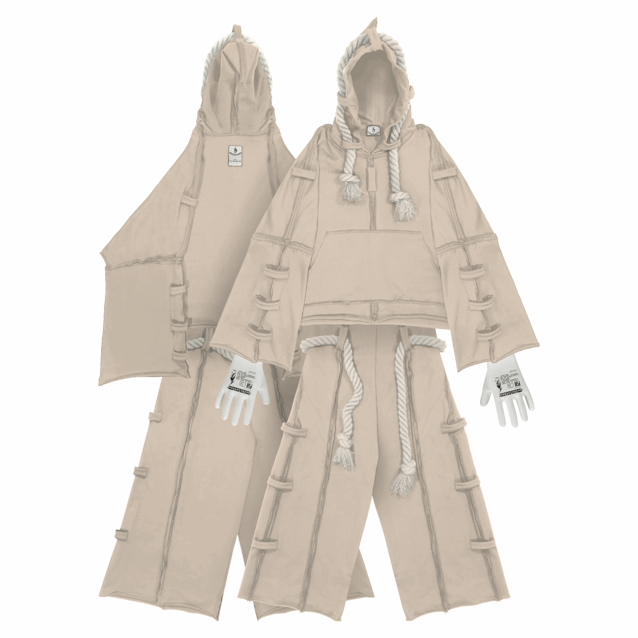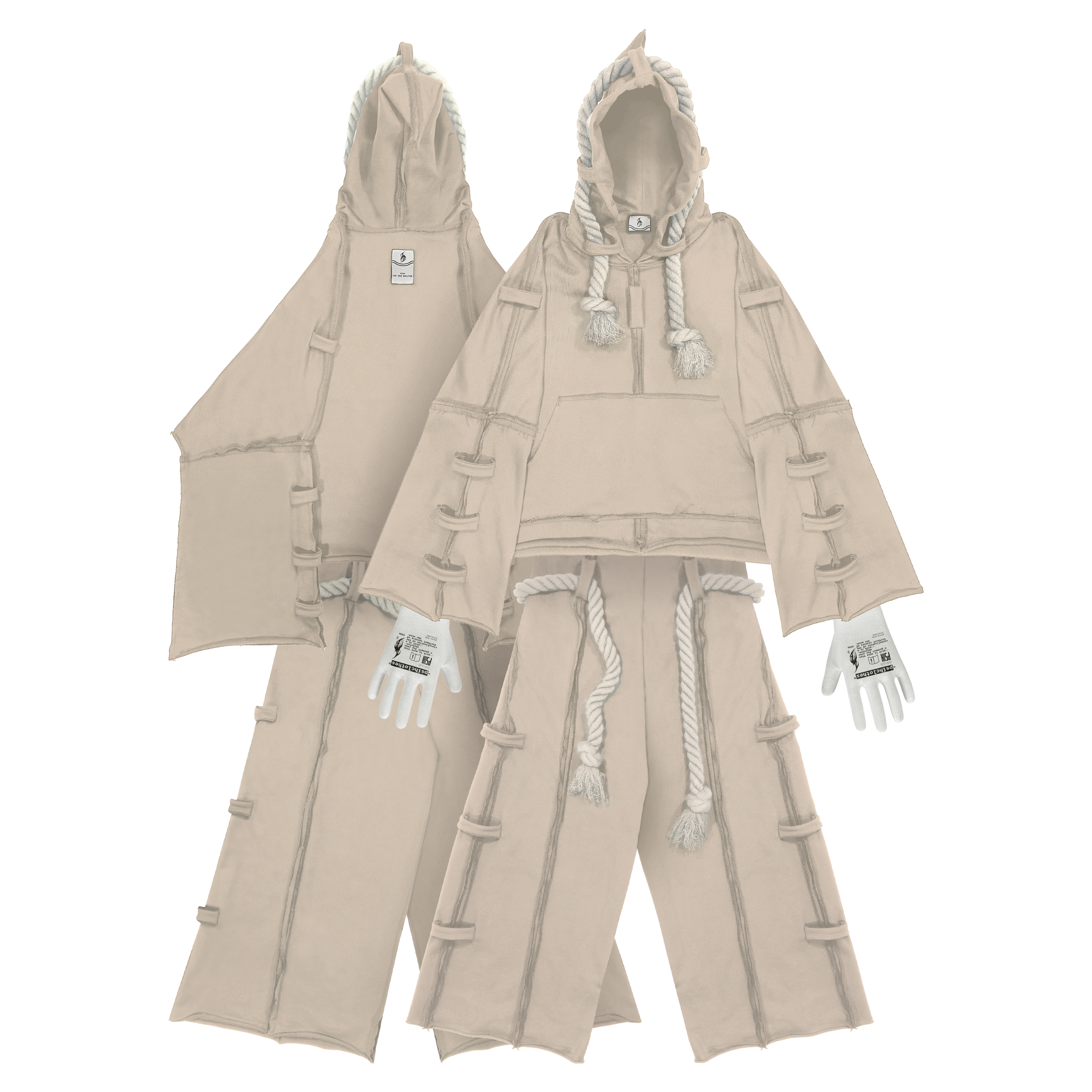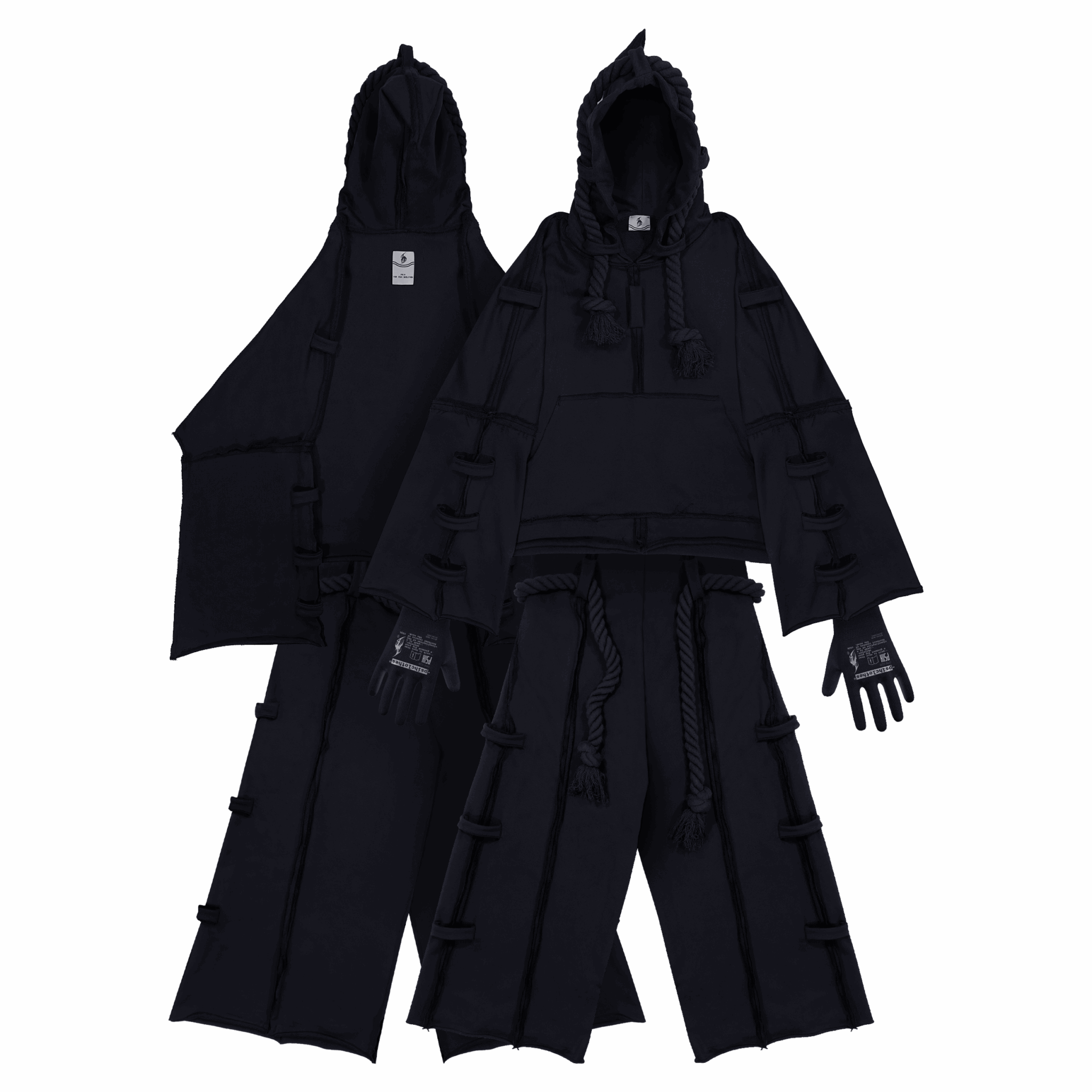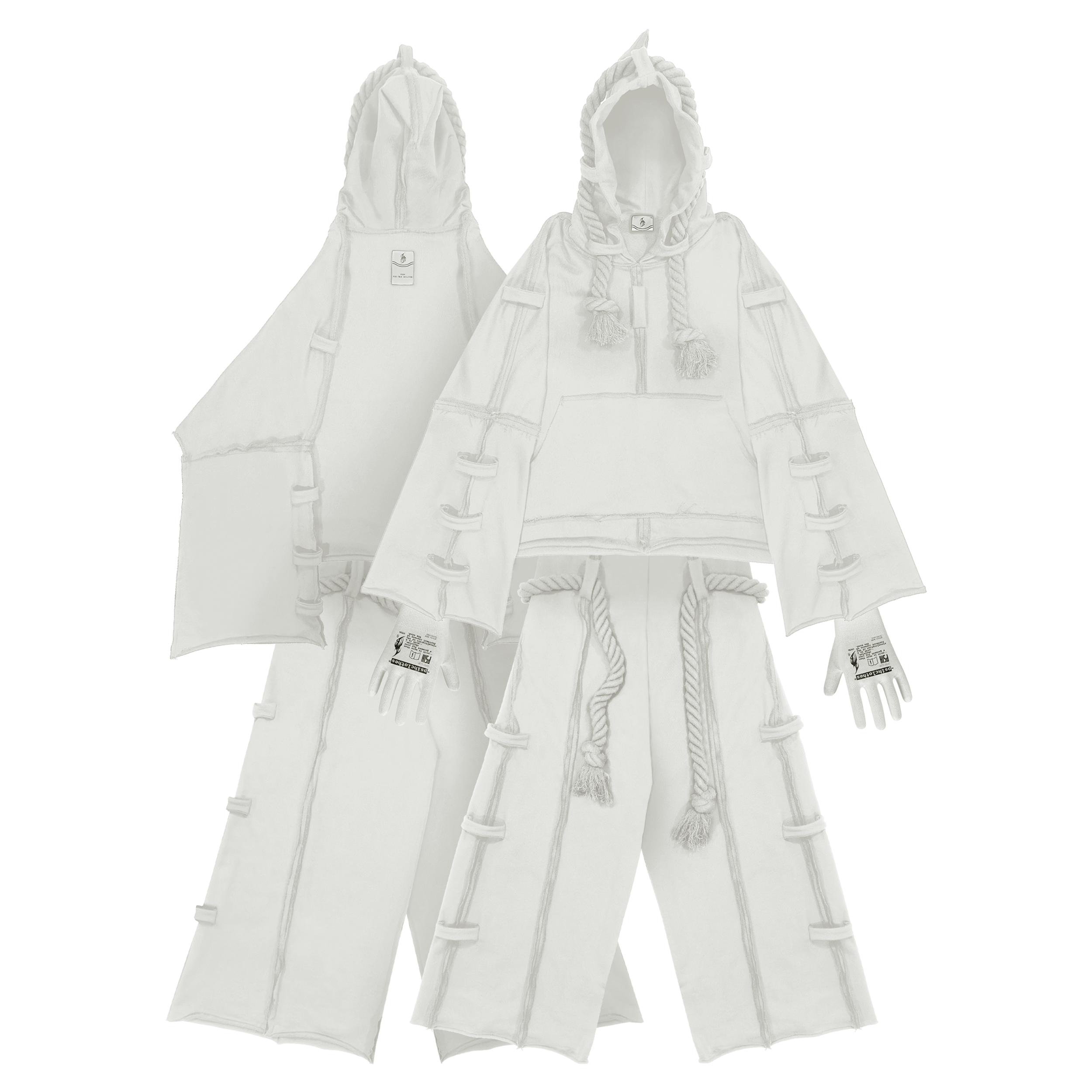 Слегка расклешенные рукава худи и низ штанов, скрытый шнурок для регулировки по талии, острый капюшон, акцентная бирка на спинках изделий.
